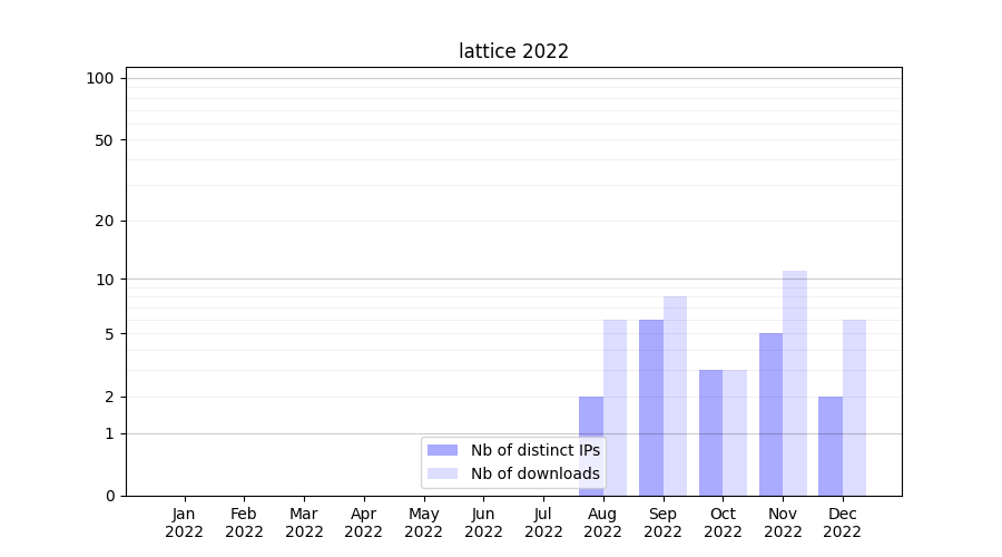 Number of downloads for annotation package lattice, year by year, from 2025 back to 2014 (years with no downloads are omitted):