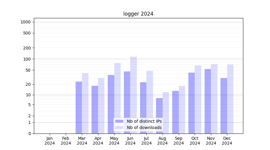 Number of downloads for annotation package logger, year by year, from 2025 back to 2014 (years with no downloads are omitted):