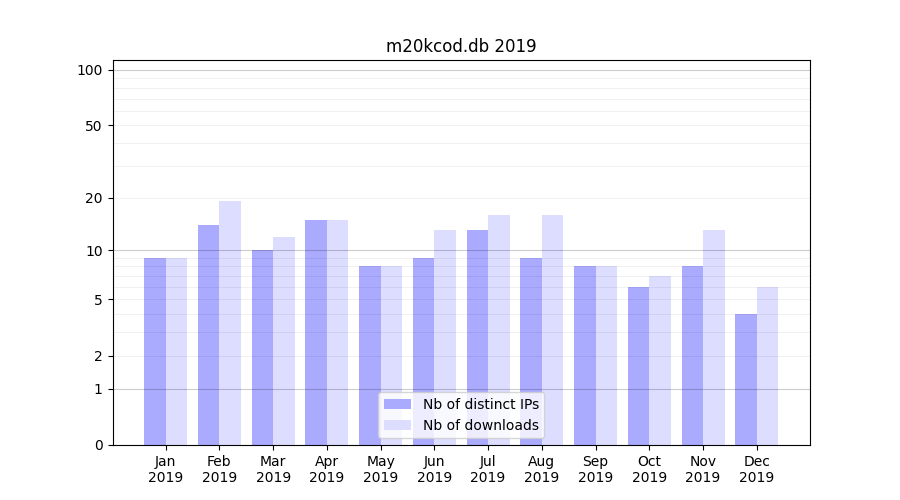 Number of downloads for annotation package m20kcod.db, year by year, from 2025 back to 2014 (years with no downloads are omitted):