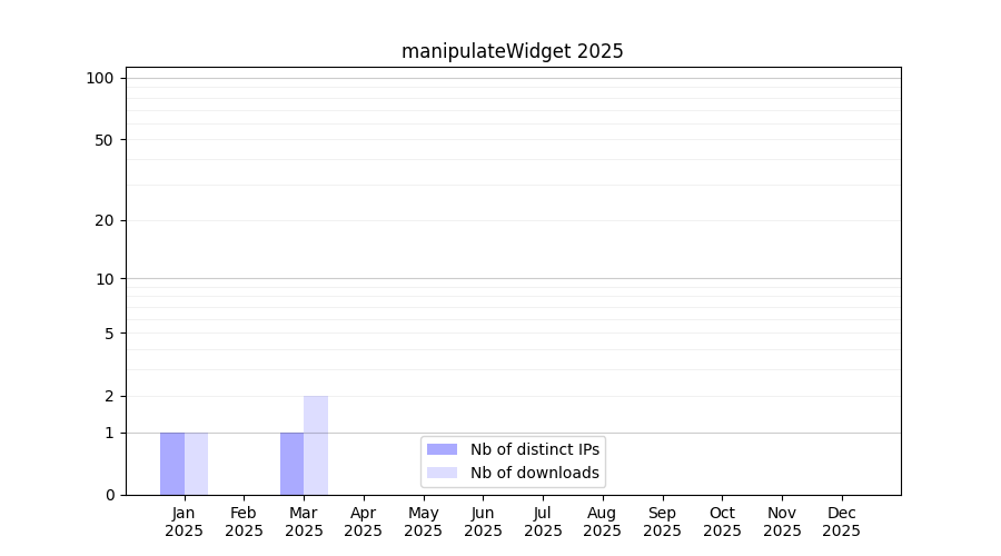 Number of downloads for annotation package manipulateWidget, year by year, from 2025 back to 2014 (years with no downloads are omitted):