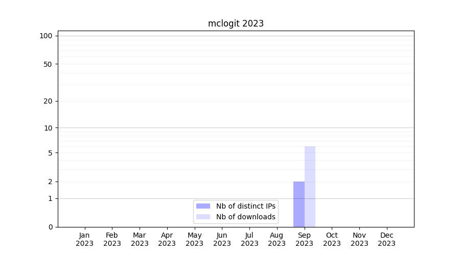 Number of downloads for annotation package mclogit, year by year, from 2025 back to 2014 (years with no downloads are omitted):