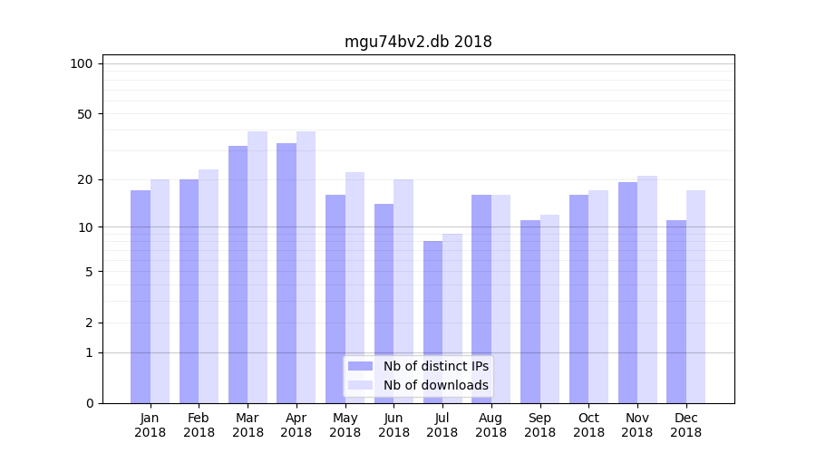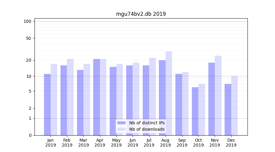 Number of downloads for annotation package mgu74bv2.db, year by year, from 2025 back to 2014 (years with no downloads are omitted):