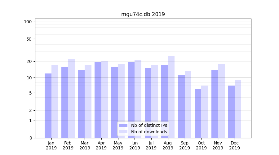 Number of downloads for annotation package mgu74c.db, year by year, from 2025 back to 2014 (years with no downloads are omitted):