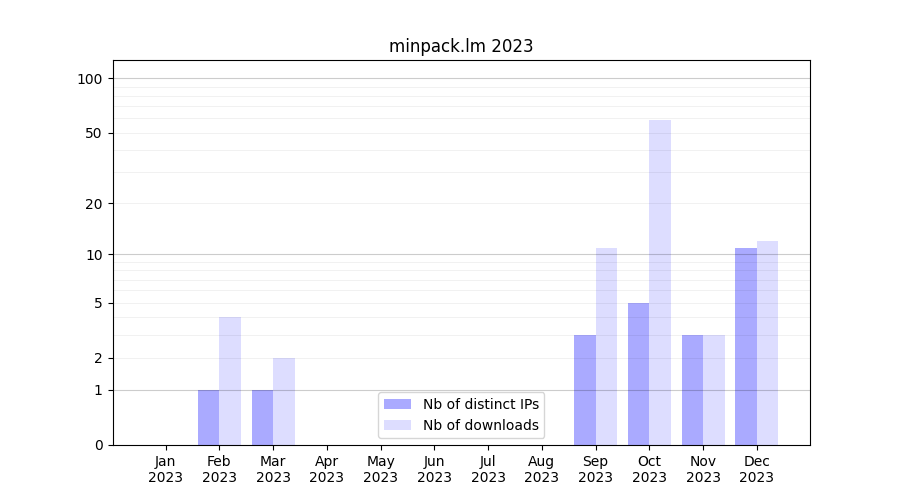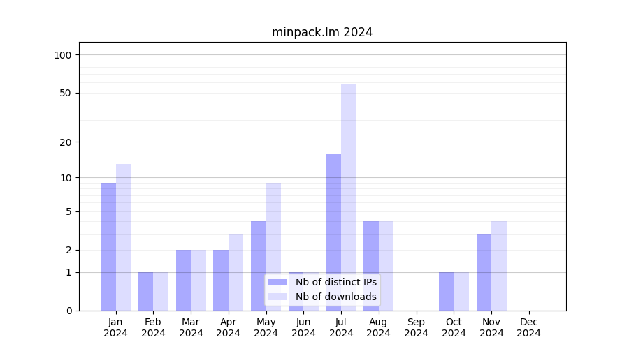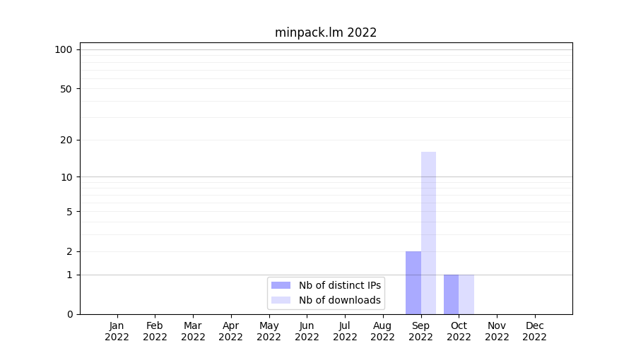 Number of downloads for annotation package minpack.lm, year by year, from 2025 back to 2014 (years with no downloads are omitted):