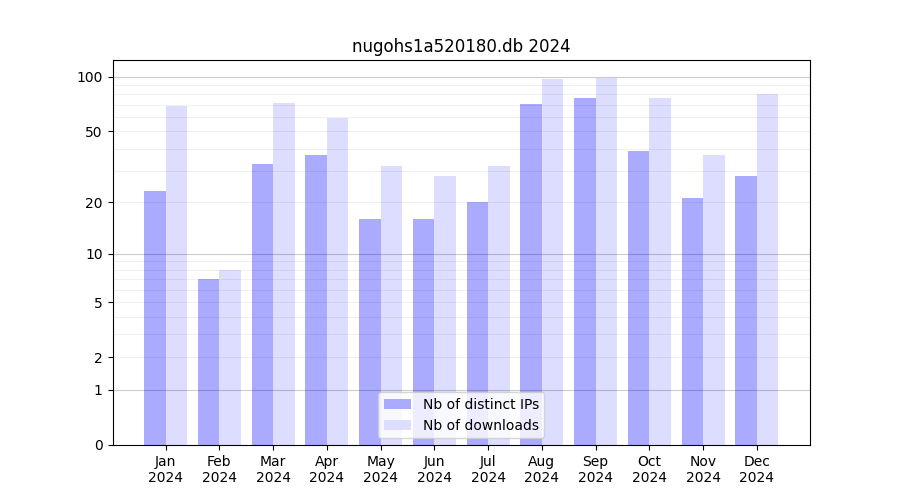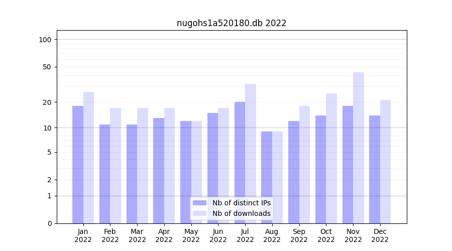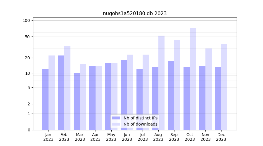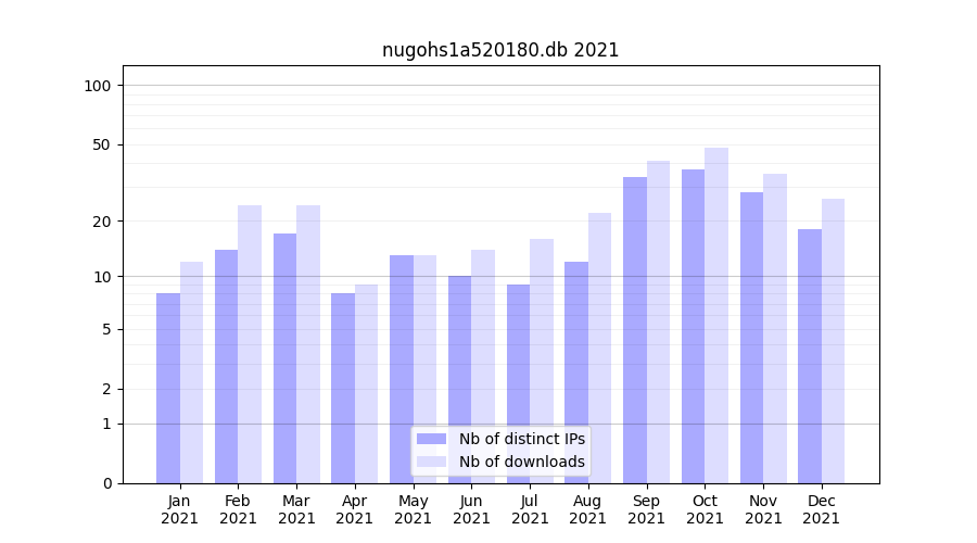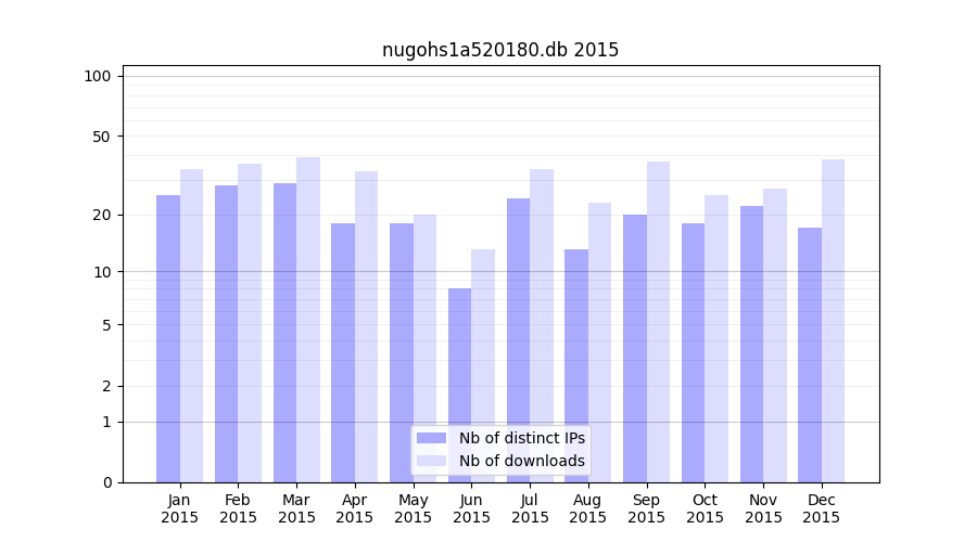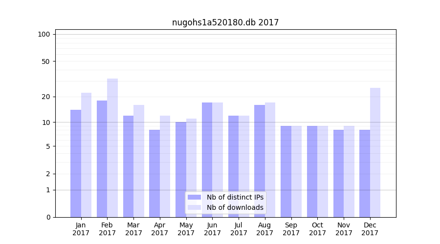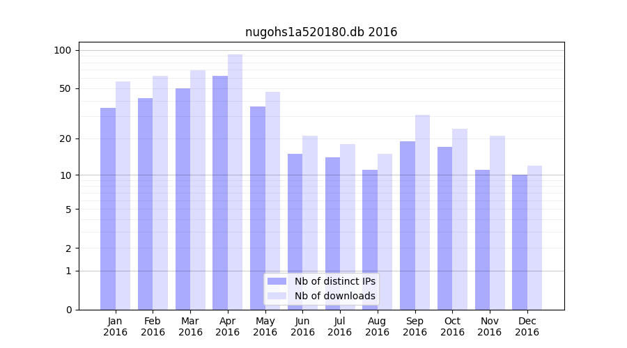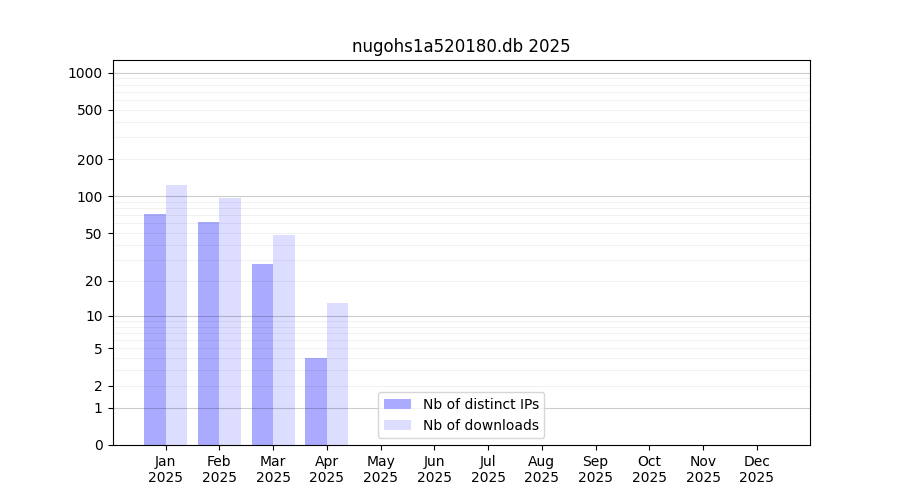 Number of downloads for annotation package nugohs1a520180.db, year by year, from 2025 back to 2014 (years with no downloads are omitted):