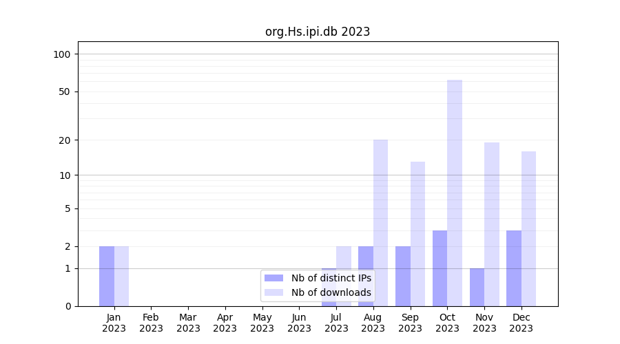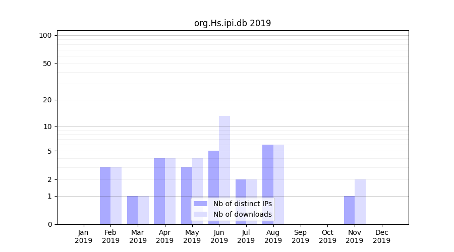 Number of downloads for annotation package org.Hs.ipi.db, year by year, from 2025 back to 2014 (years with no downloads are omitted):