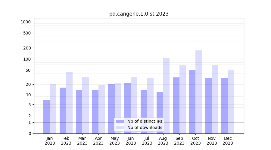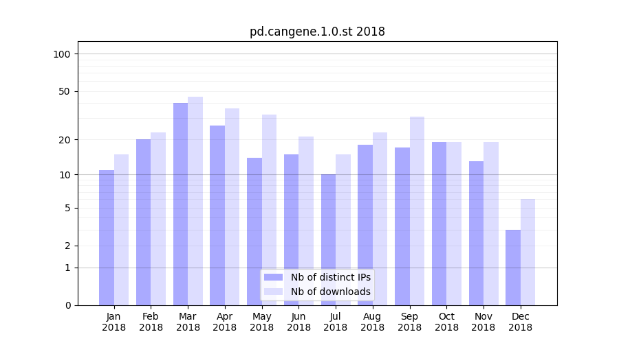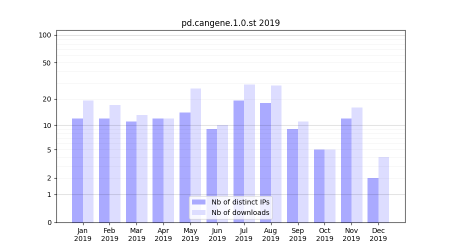 Number of downloads for annotation package pd.cangene.1.0.st, year by year, from 2025 back to 2014 (years with no downloads are omitted):
