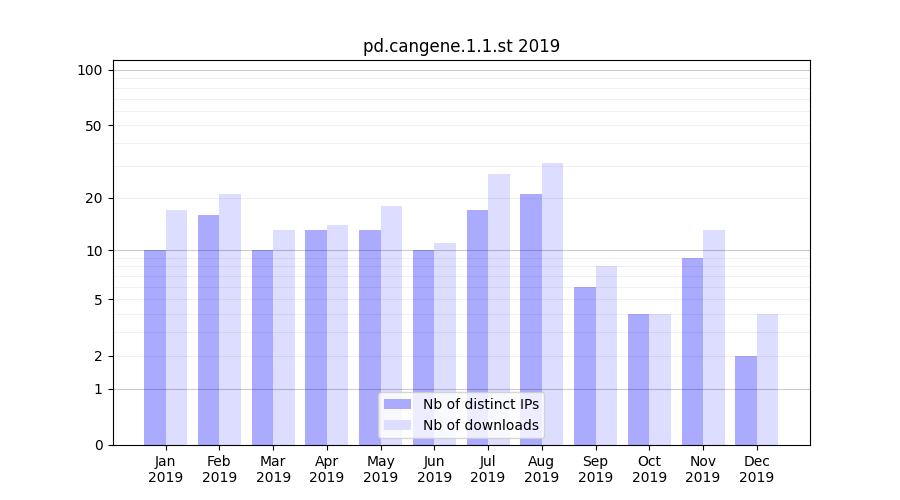 Number of downloads for annotation package pd.cangene.1.1.st, year by year, from 2025 back to 2014 (years with no downloads are omitted):
