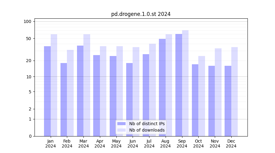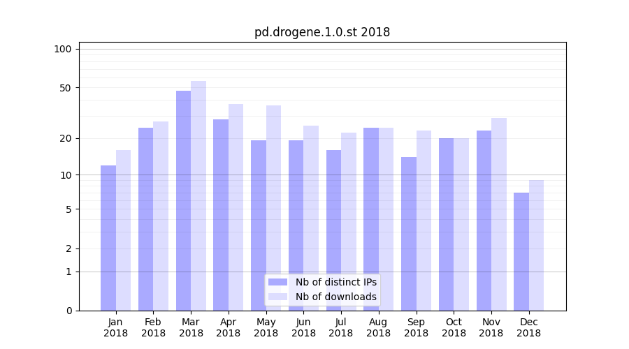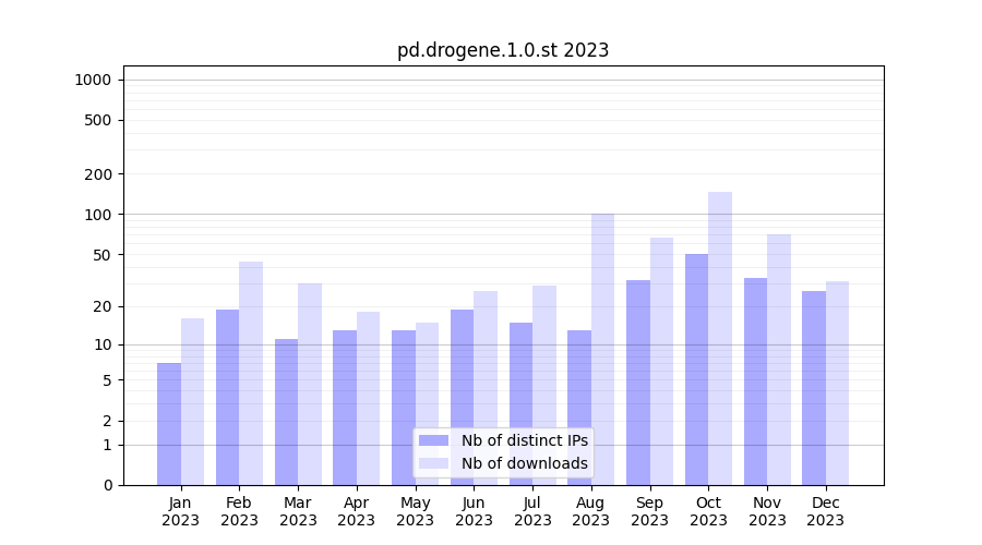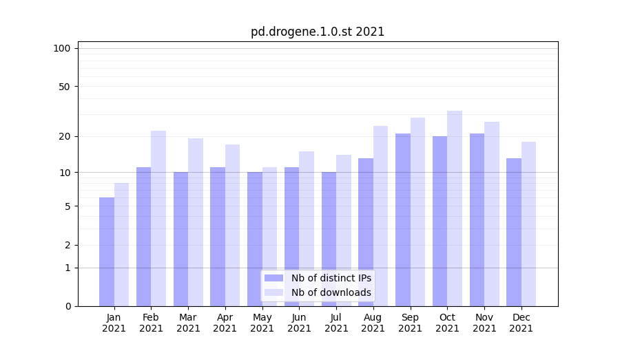 Number of downloads for annotation package pd.drogene.1.0.st, year by year, from 2025 back to 2014 (years with no downloads are omitted):