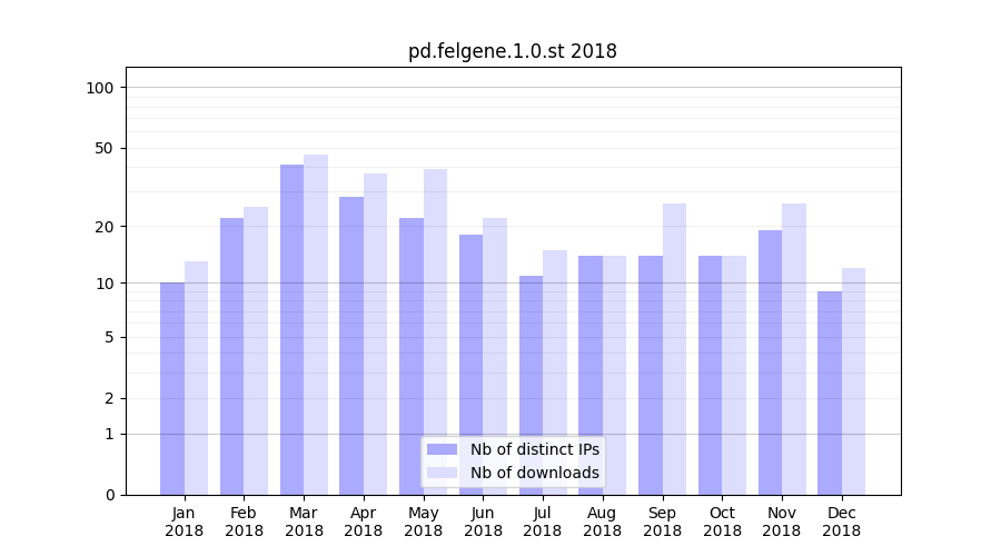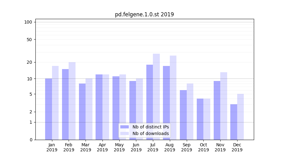 Number of downloads for annotation package pd.felgene.1.0.st, year by year, from 2025 back to 2014 (years with no downloads are omitted):