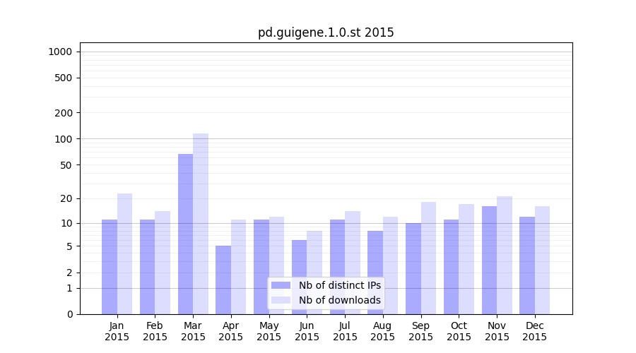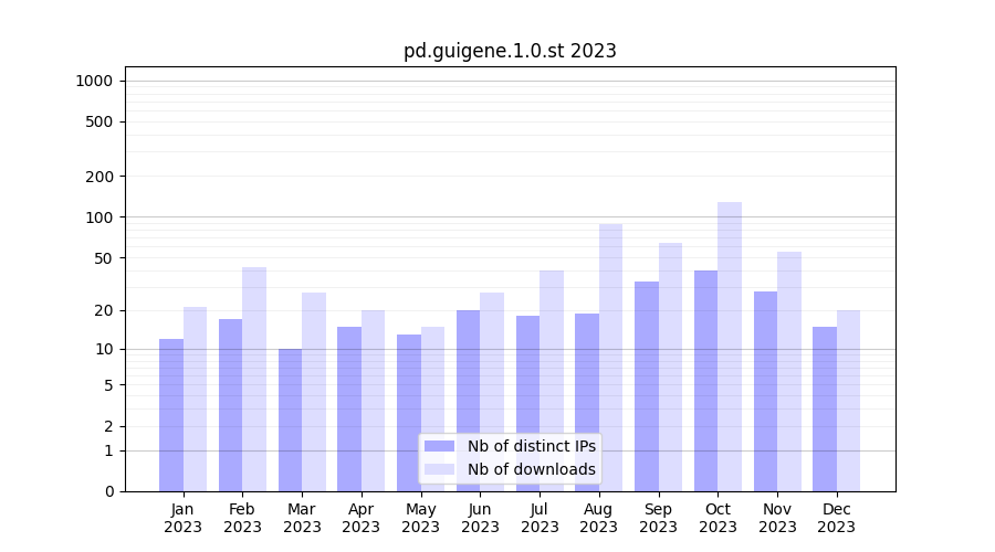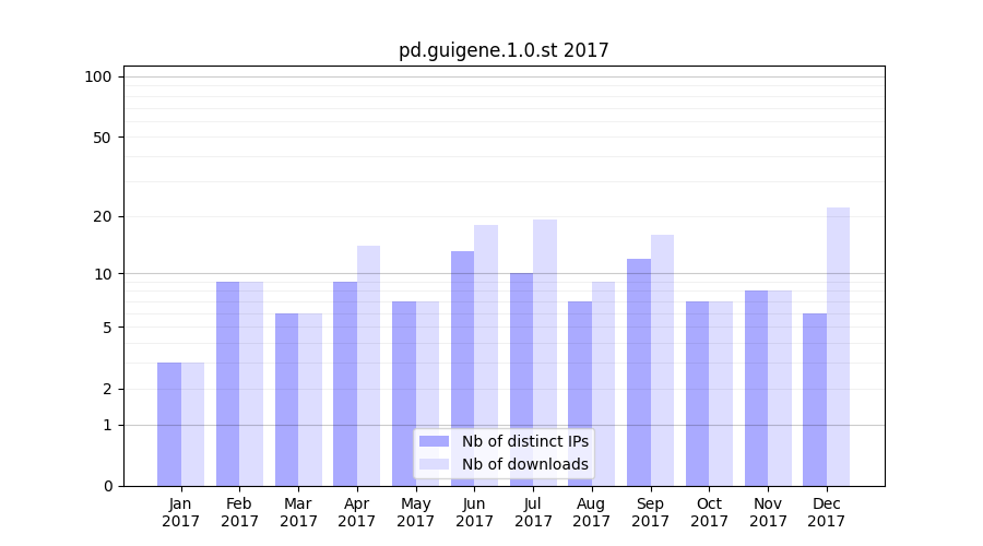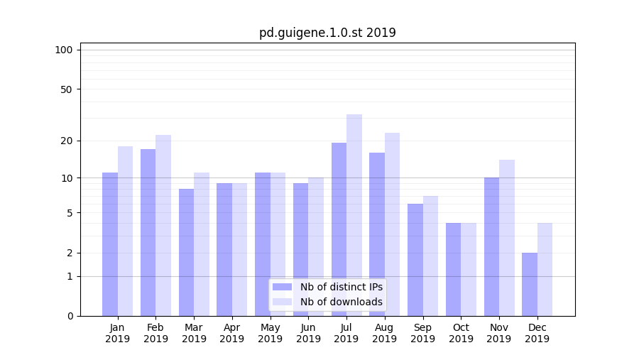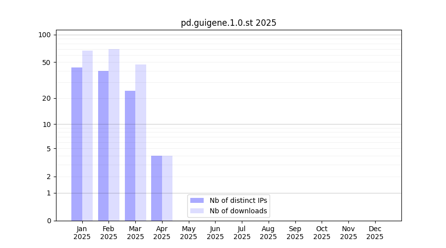 Number of downloads for annotation package pd.guigene.1.0.st, year by year, from 2025 back to 2014 (years with no downloads are omitted):