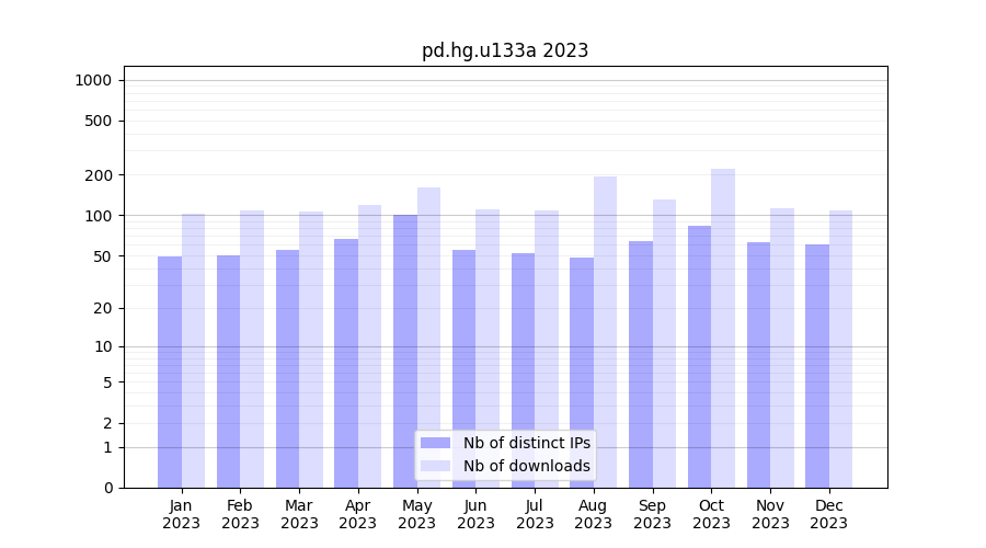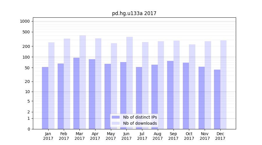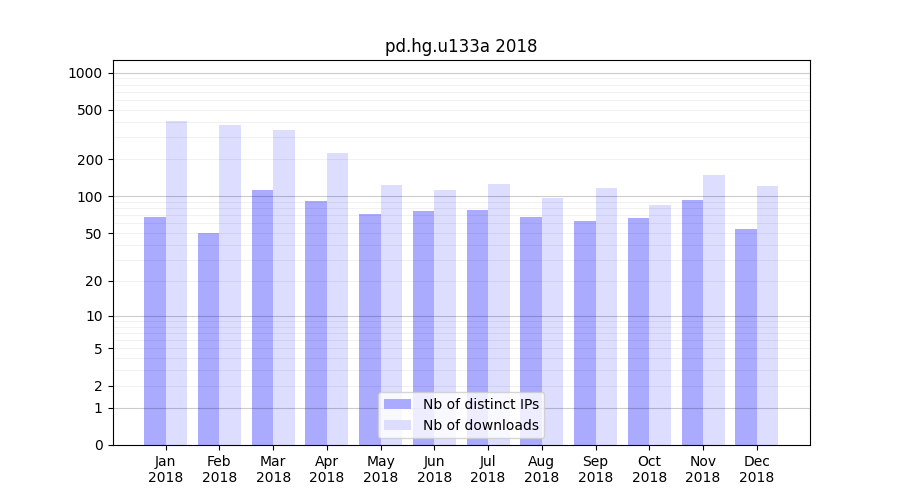 Number of downloads for annotation package pd.hg.u133a, year by year, from 2025 back to 2014 (years with no downloads are omitted):