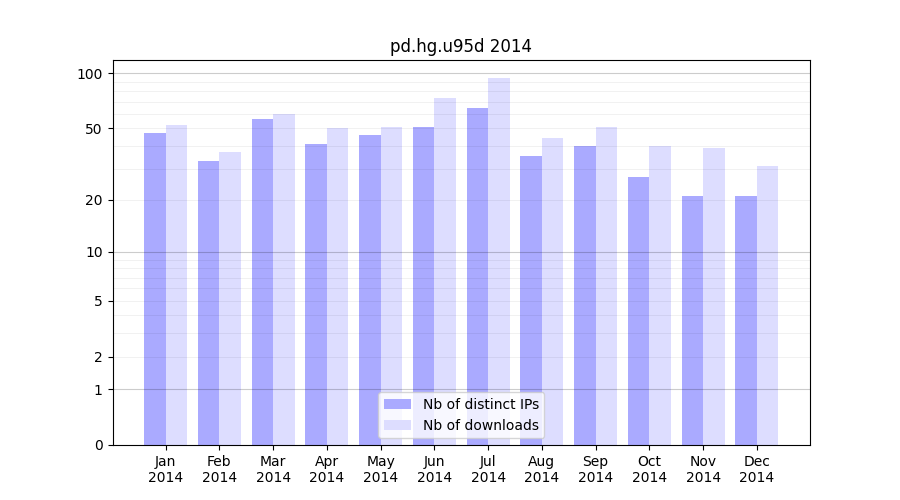 Number of downloads for annotation package pd.hg.u95d, year by year, from 2025 back to 2014 (years with no downloads are omitted):