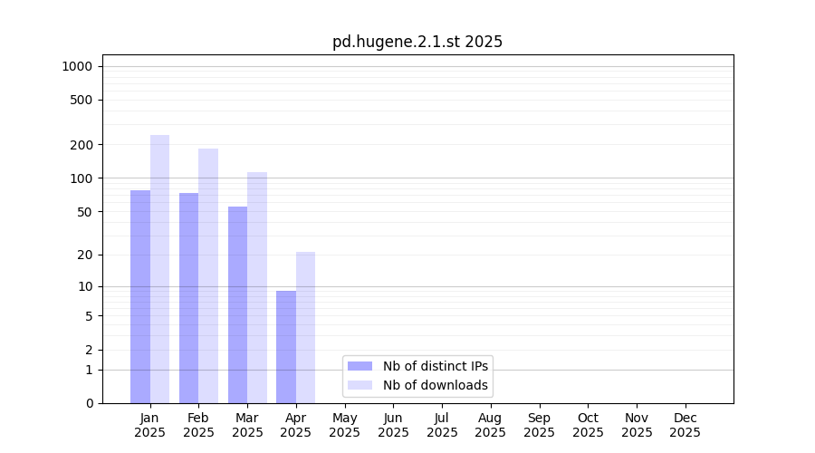 Number of downloads for annotation package pd.hugene.2.1.st, year by year, from 2025 back to 2014 (years with no downloads are omitted):