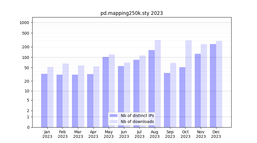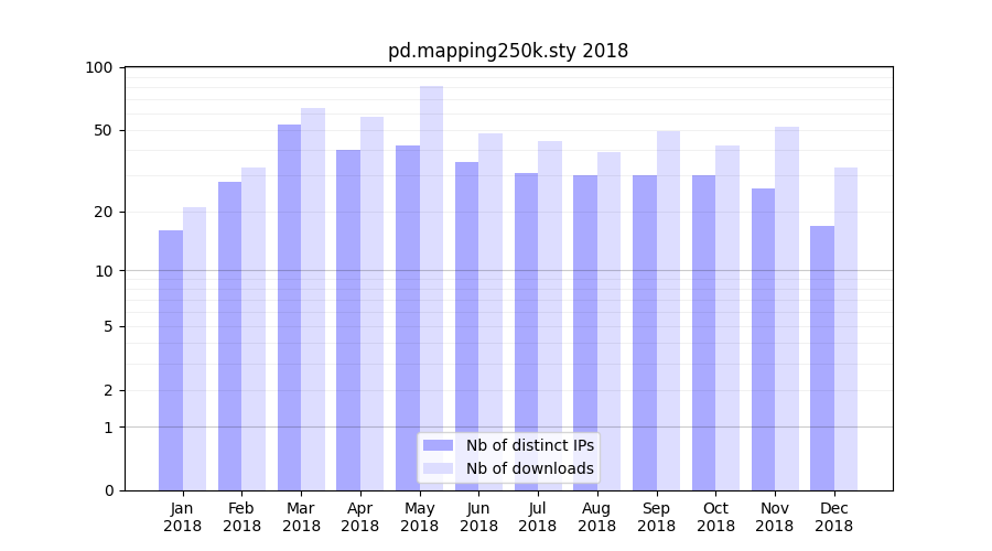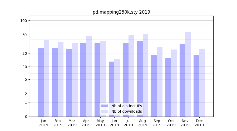 Number of downloads for annotation package pd.mapping250k.sty, year by year, from 2025 back to 2014 (years with no downloads are omitted):