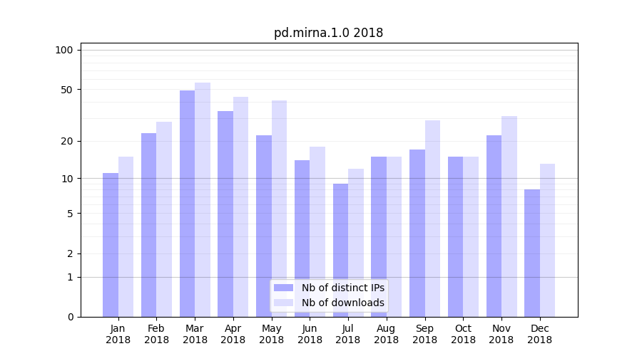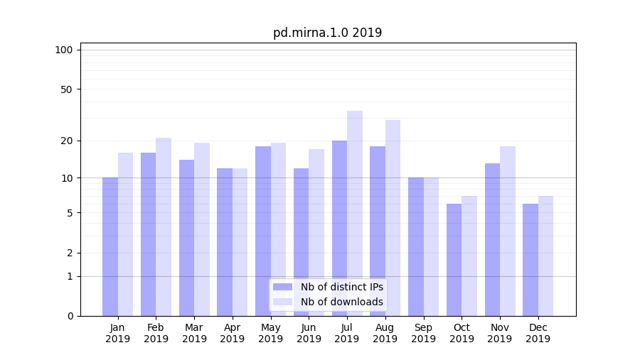 Number of downloads for annotation package pd.mirna.1.0, year by year, from 2025 back to 2014 (years with no downloads are omitted):