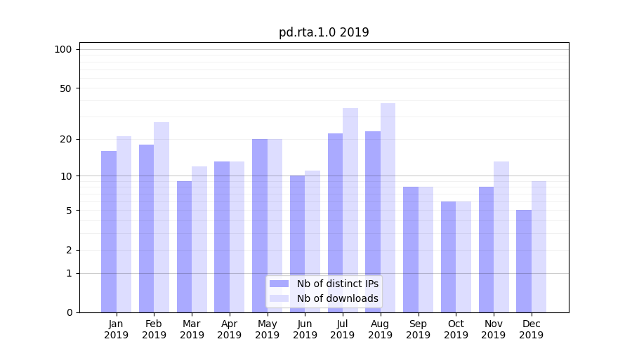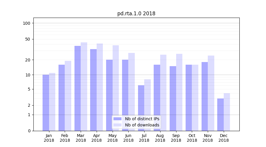 Number of downloads for annotation package pd.rta.1.0, year by year, from 2025 back to 2014 (years with no downloads are omitted):