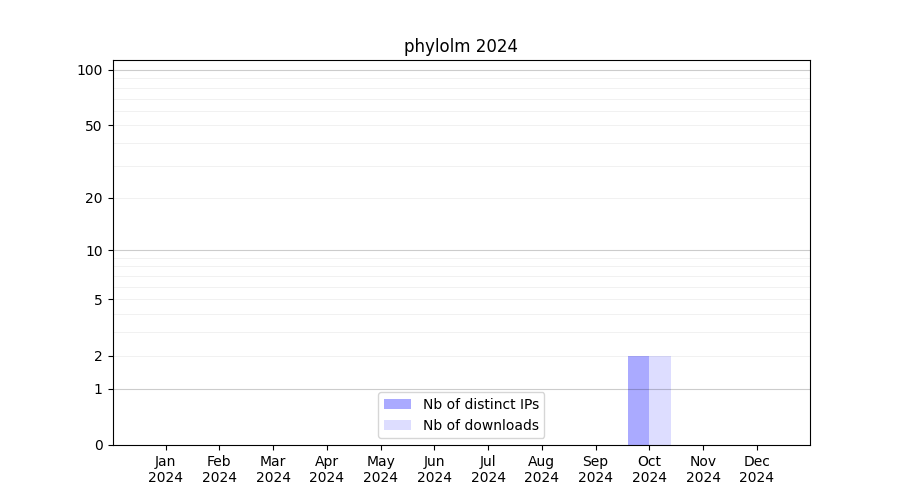 Number of downloads for annotation package phylolm, year by year, from 2025 back to 2014 (years with no downloads are omitted):
