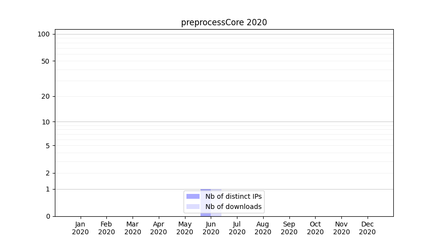 Number of downloads for annotation package preprocessCore, year by year, from 2025 back to 2014 (years with no downloads are omitted):