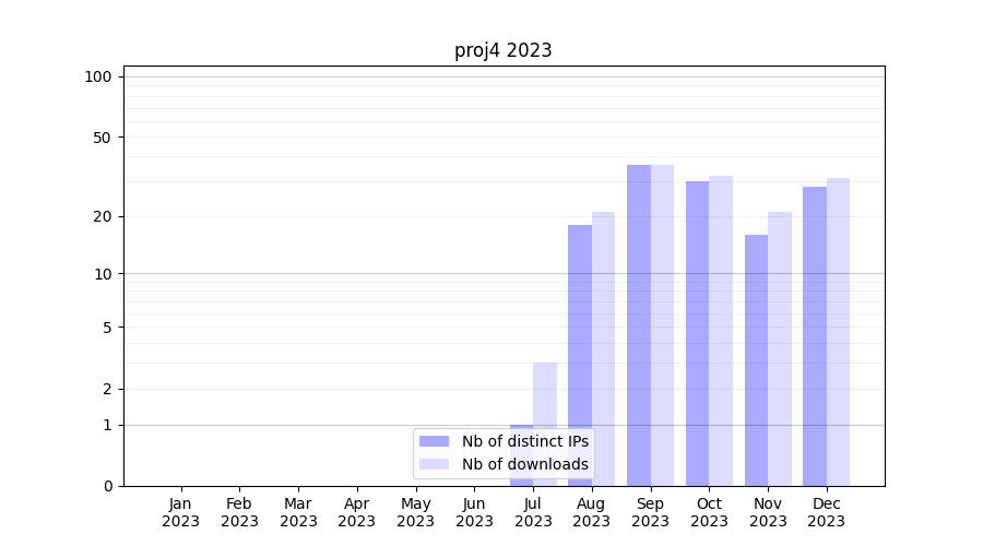 Number of downloads for annotation package proj4, year by year, from 2025 back to 2014 (years with no downloads are omitted):