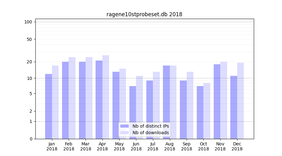 Number of downloads for annotation package ragene10stprobeset.db, year by year, from 2025 back to 2014 (years with no downloads are omitted):