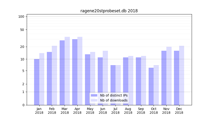 Number of downloads for annotation package ragene20stprobeset.db, year by year, from 2025 back to 2014 (years with no downloads are omitted):