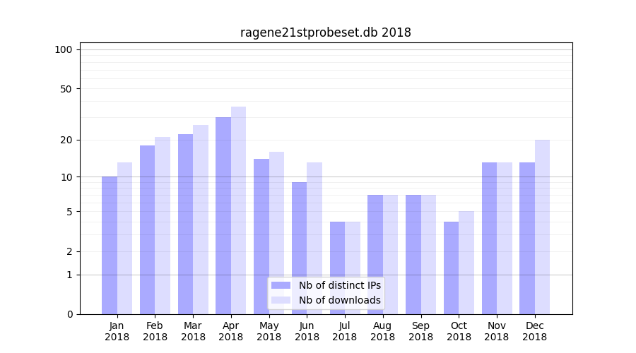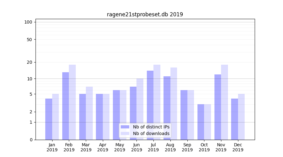 Number of downloads for annotation package ragene21stprobeset.db, year by year, from 2025 back to 2014 (years with no downloads are omitted):