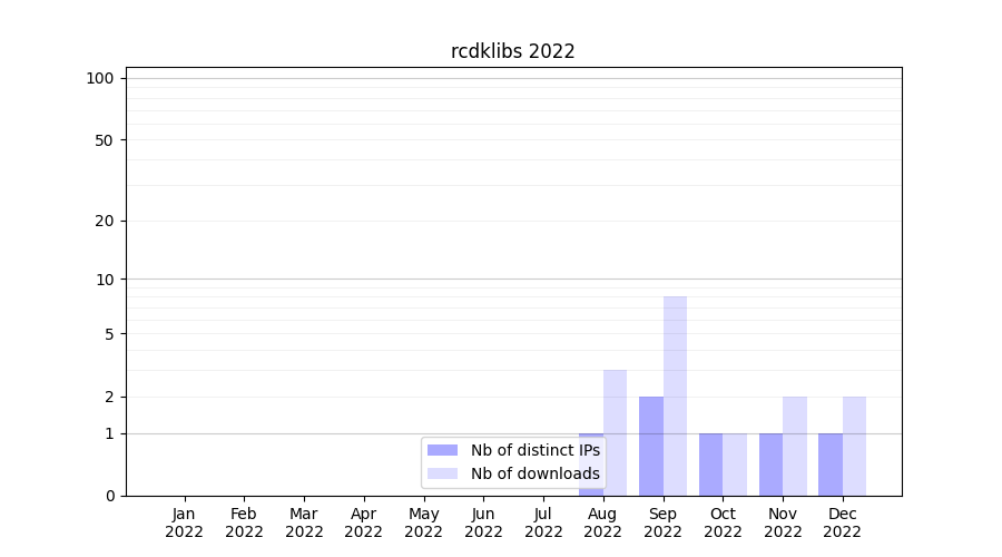 Number of downloads for annotation package rcdklibs, year by year, from 2025 back to 2014 (years with no downloads are omitted):