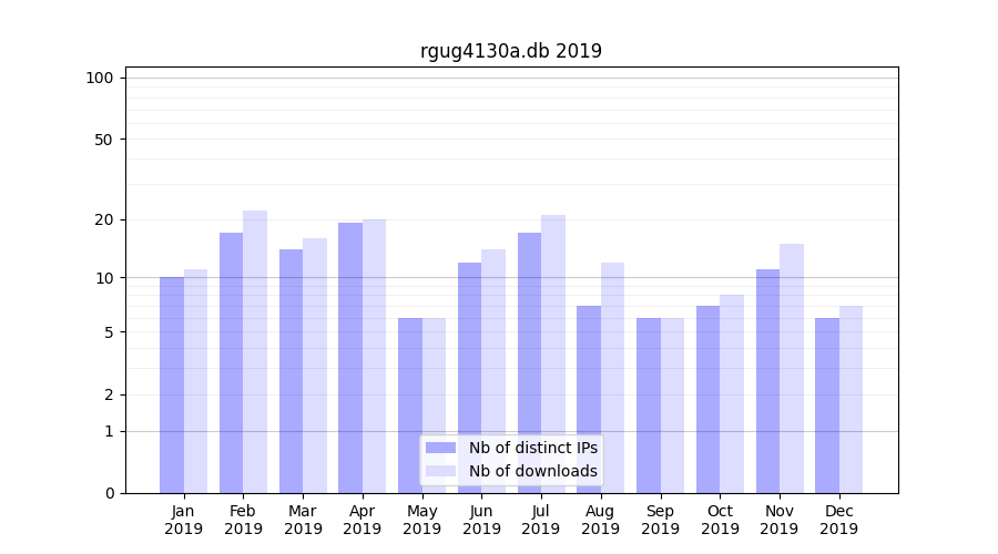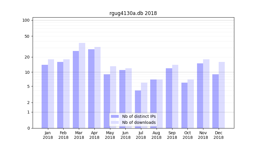 Number of downloads for annotation package rgug4130a.db, year by year, from 2025 back to 2014 (years with no downloads are omitted):