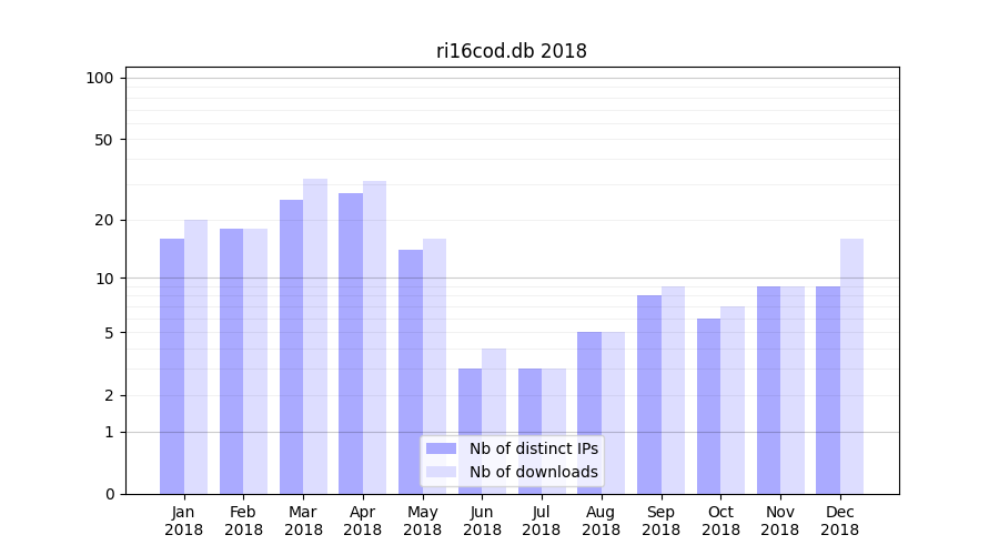 Number of downloads for annotation package ri16cod.db, year by year, from 2025 back to 2014 (years with no downloads are omitted):