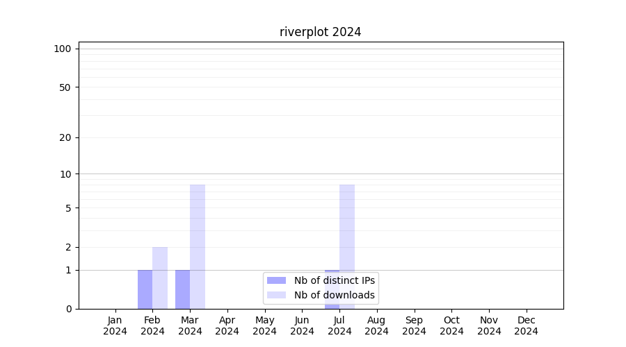 Number of downloads for annotation package riverplot, year by year, from 2025 back to 2014 (years with no downloads are omitted):