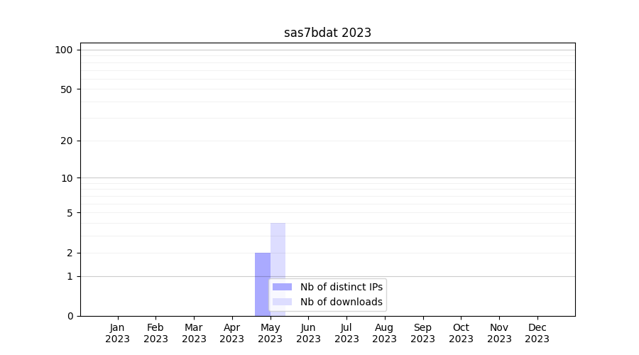 Number of downloads for annotation package sas7bdat, year by year, from 2025 back to 2014 (years with no downloads are omitted):