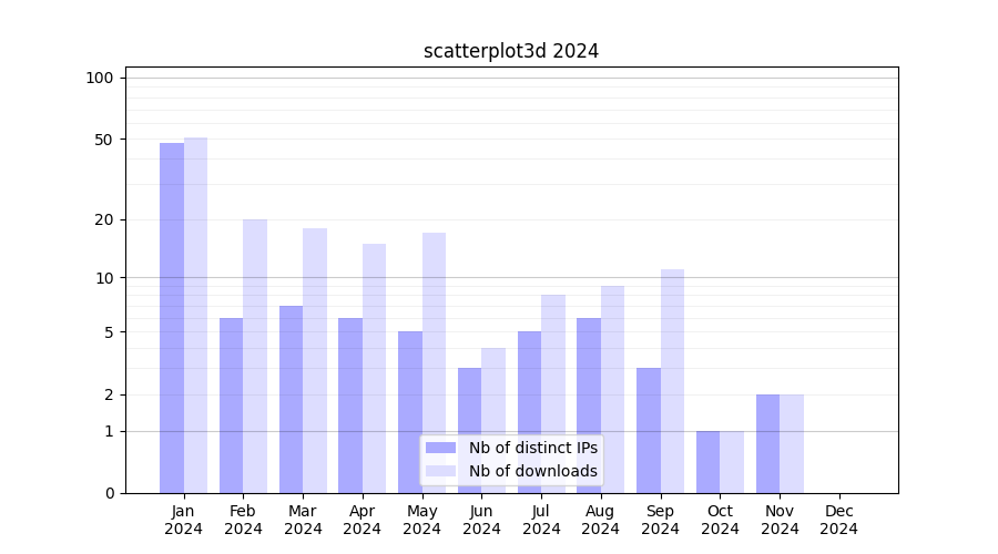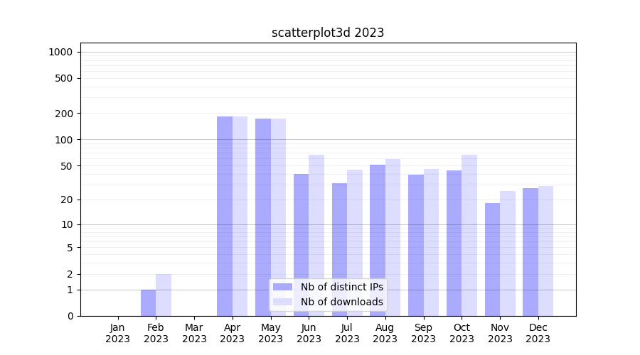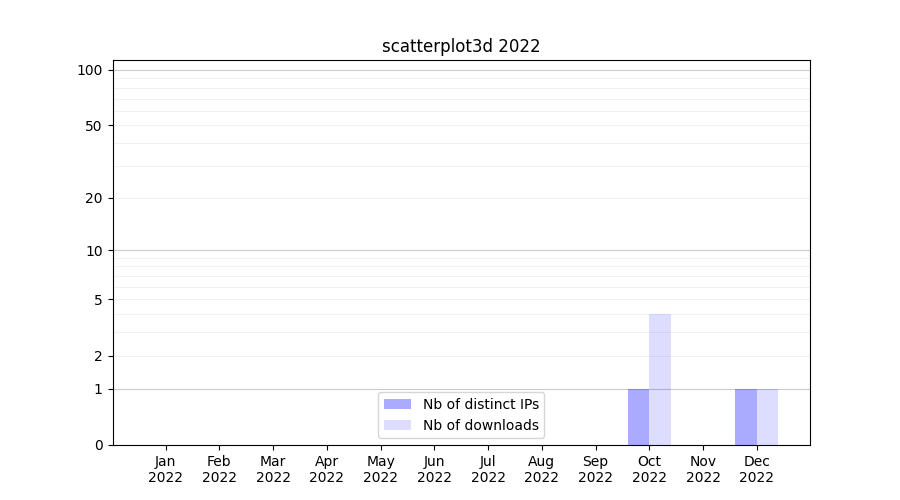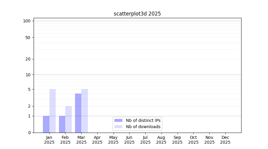 Number of downloads for annotation package scatterplot3d, year by year, from 2025 back to 2014 (years with no downloads are omitted):