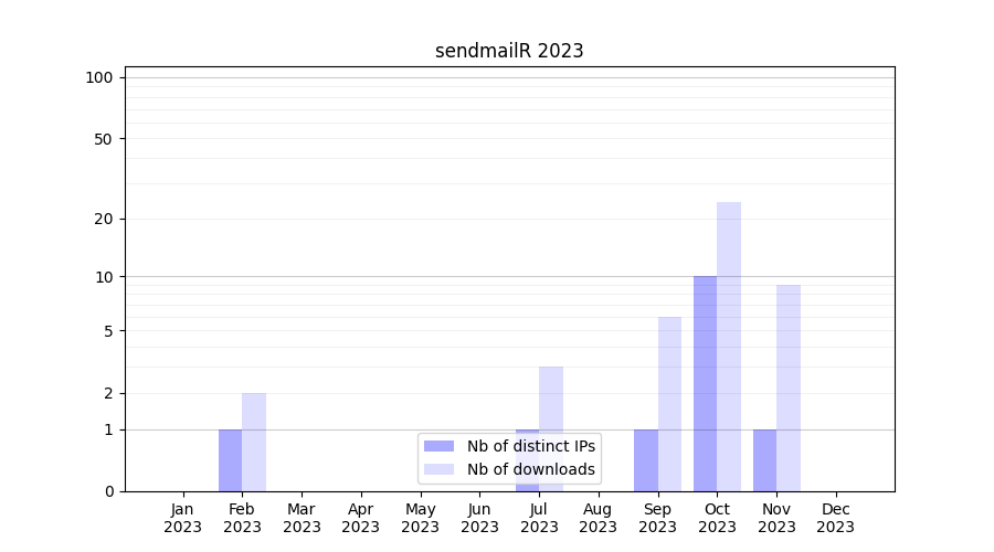 Number of downloads for annotation package sendmailR, year by year, from 2025 back to 2014 (years with no downloads are omitted):