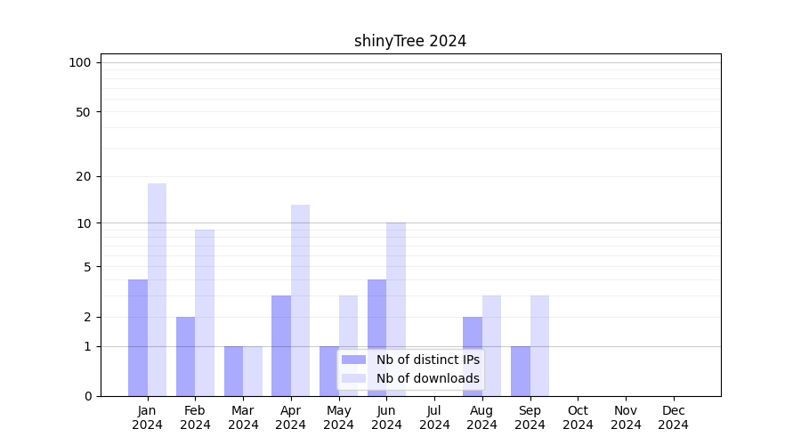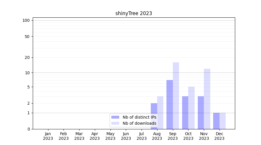 Number of downloads for annotation package shinyTree, year by year, from 2025 back to 2014 (years with no downloads are omitted):