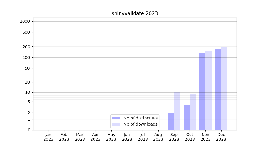 Number of downloads for annotation package shinyvalidate, year by year, from 2025 back to 2014 (years with no downloads are omitted):