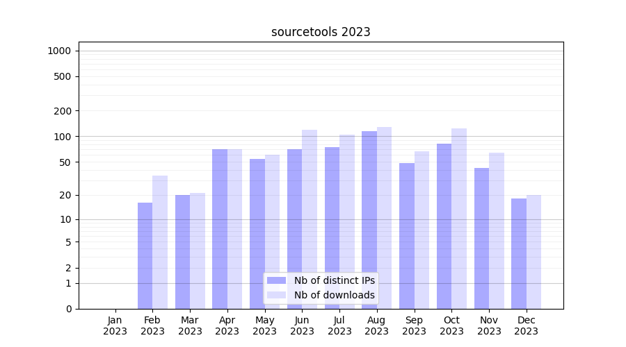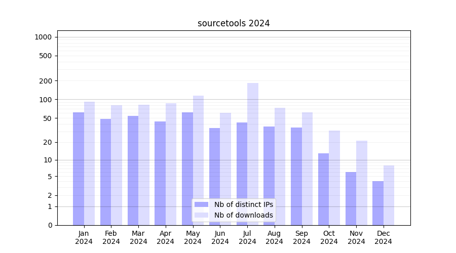 Number of downloads for annotation package sourcetools, year by year, from 2025 back to 2014 (years with no downloads are omitted):