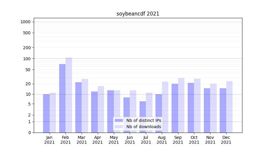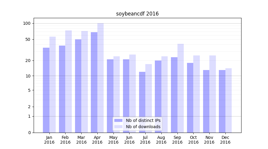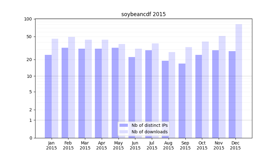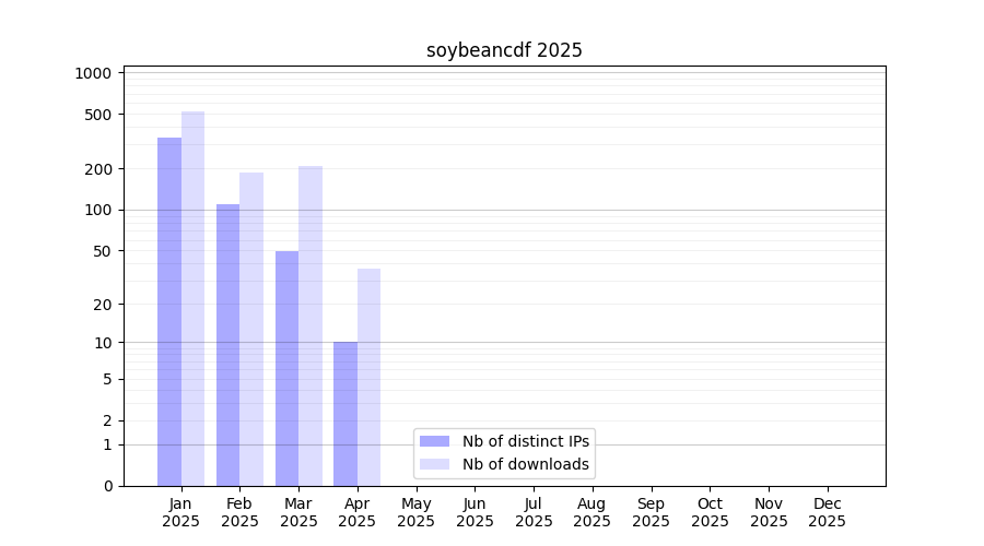 Number of downloads for annotation package soybeancdf, year by year, from 2025 back to 2014 (years with no downloads are omitted):