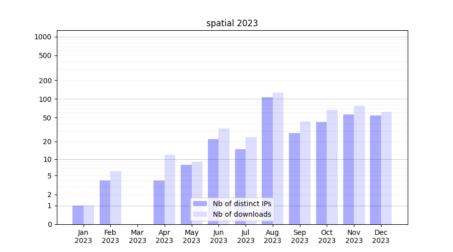 Number of downloads for annotation package spatial, year by year, from 2025 back to 2014 (years with no downloads are omitted):