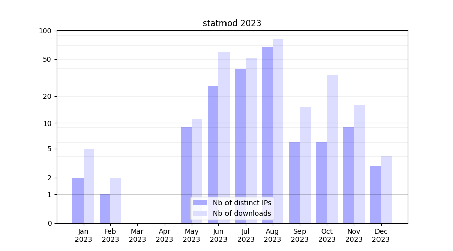 Number of downloads for annotation package statmod, year by year, from 2025 back to 2014 (years with no downloads are omitted):