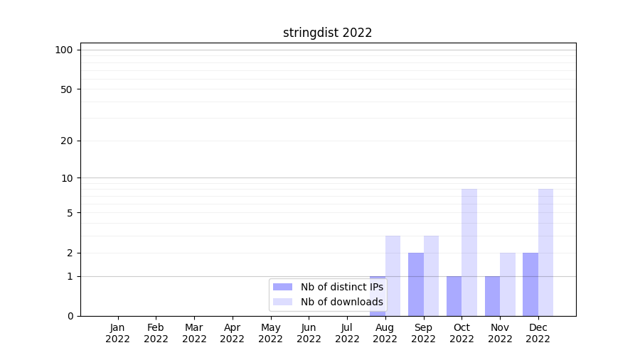 Number of downloads for annotation package stringdist, year by year, from 2025 back to 2014 (years with no downloads are omitted):