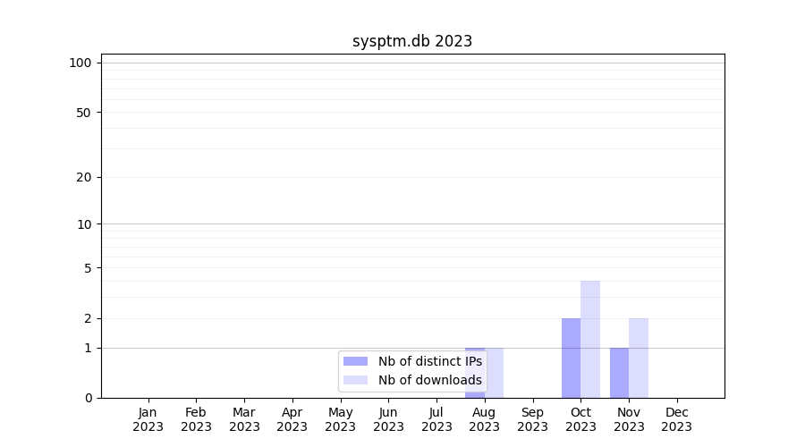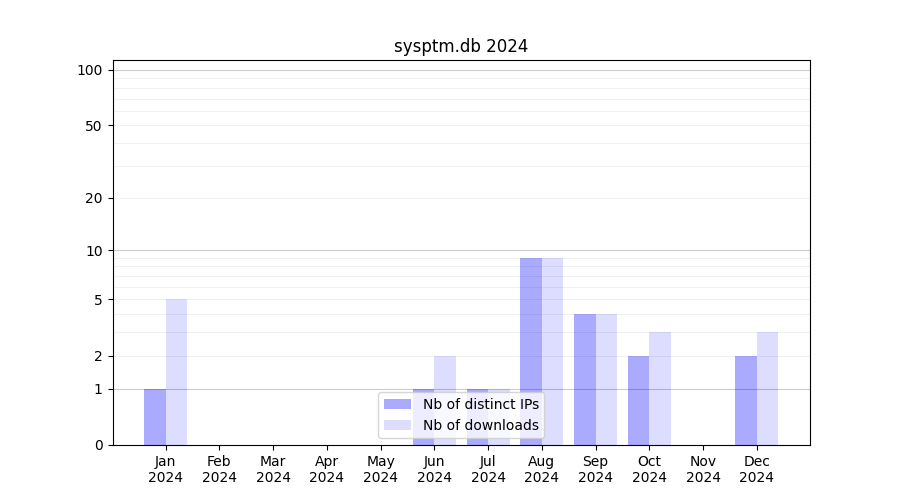Number of downloads for annotation package sysptm.db, year by year, from 2025 back to 2014 (years with no downloads are omitted):