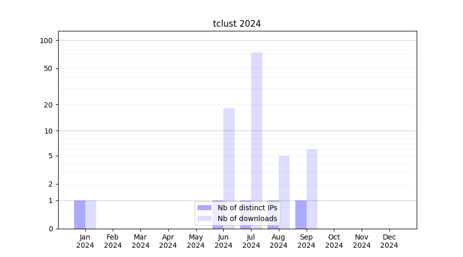 Number of downloads for annotation package tclust, year by year, from 2025 back to 2014 (years with no downloads are omitted):