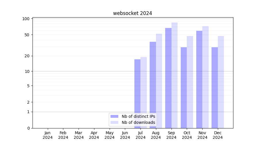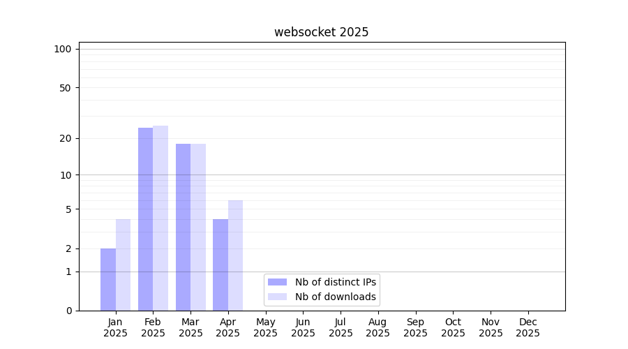 Number of downloads for annotation package websocket, year by year, from 2025 back to 2014 (years with no downloads are omitted):