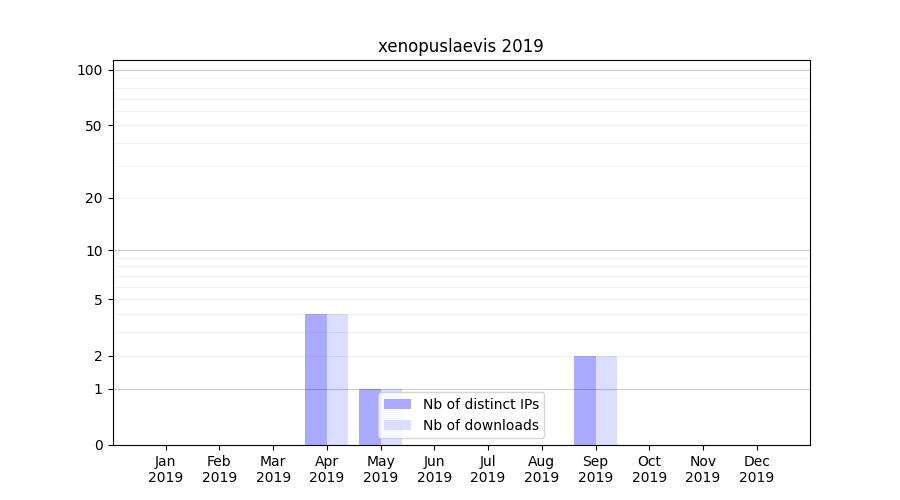 Number of downloads for annotation package xenopuslaevis, year by year, from 2025 back to 2014 (years with no downloads are omitted):