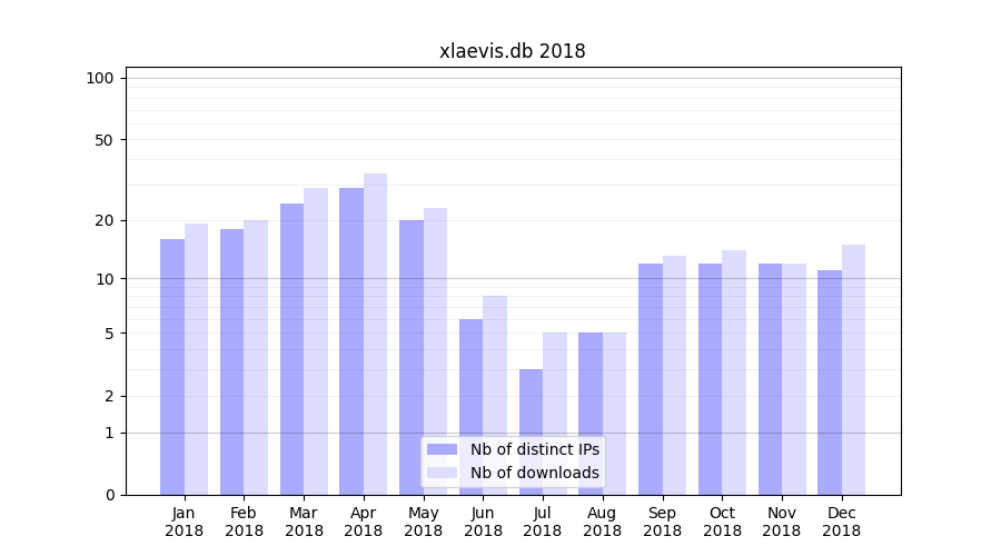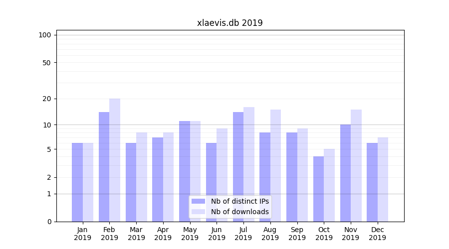 Number of downloads for annotation package xlaevis.db, year by year, from 2025 back to 2014 (years with no downloads are omitted):