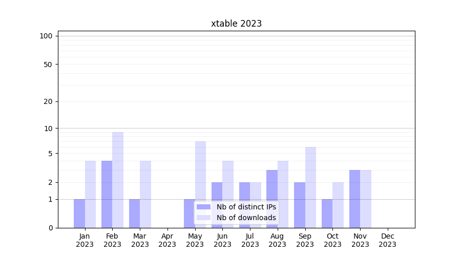 Number of downloads for annotation package xtable, year by year, from 2025 back to 2014 (years with no downloads are omitted):