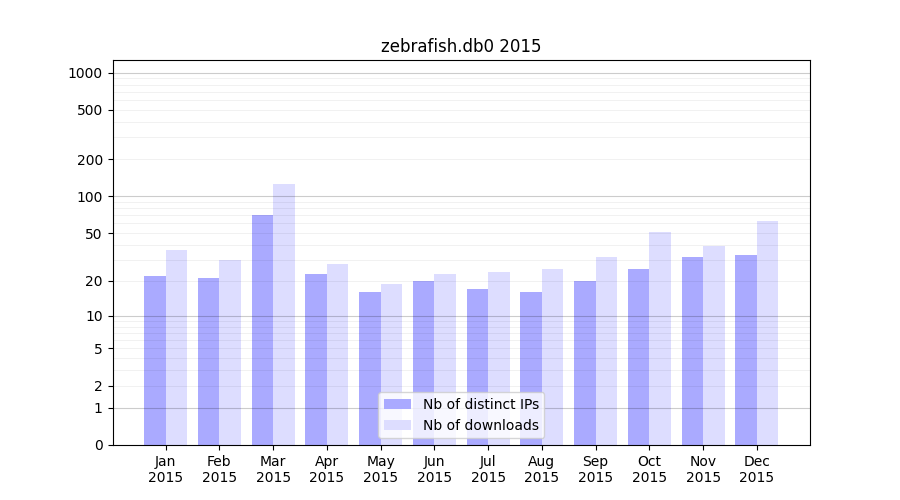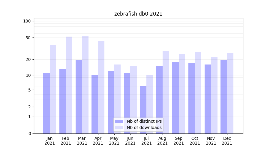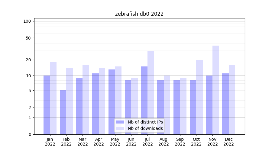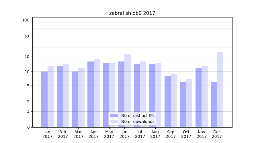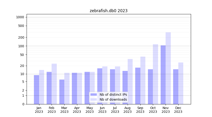 Number of downloads for annotation package zebrafish.db0, year by year, from 2025 back to 2014 (years with no downloads are omitted):