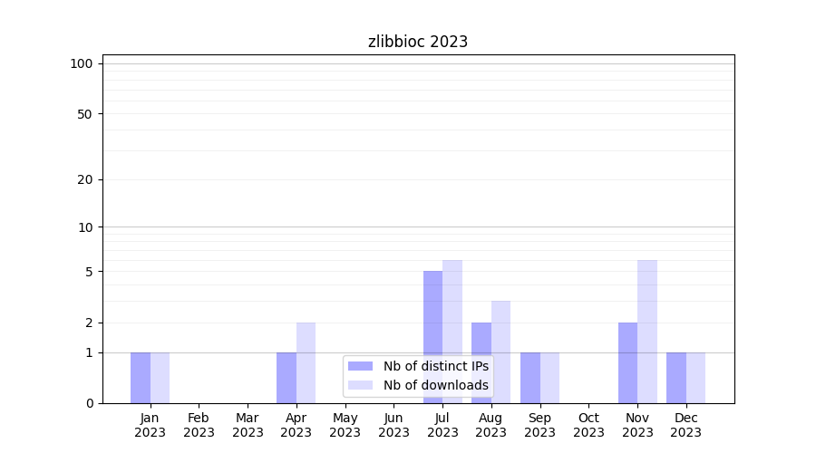 Number of downloads for annotation package zlibbioc, year by year, from 2025 back to 2014 (years with no downloads are omitted):