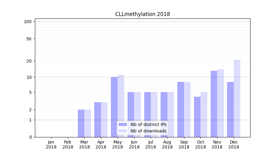 Number of downloads for experiment package CLLmethylation, year by year, from 2025 back to 2014 (years with no downloads are omitted):